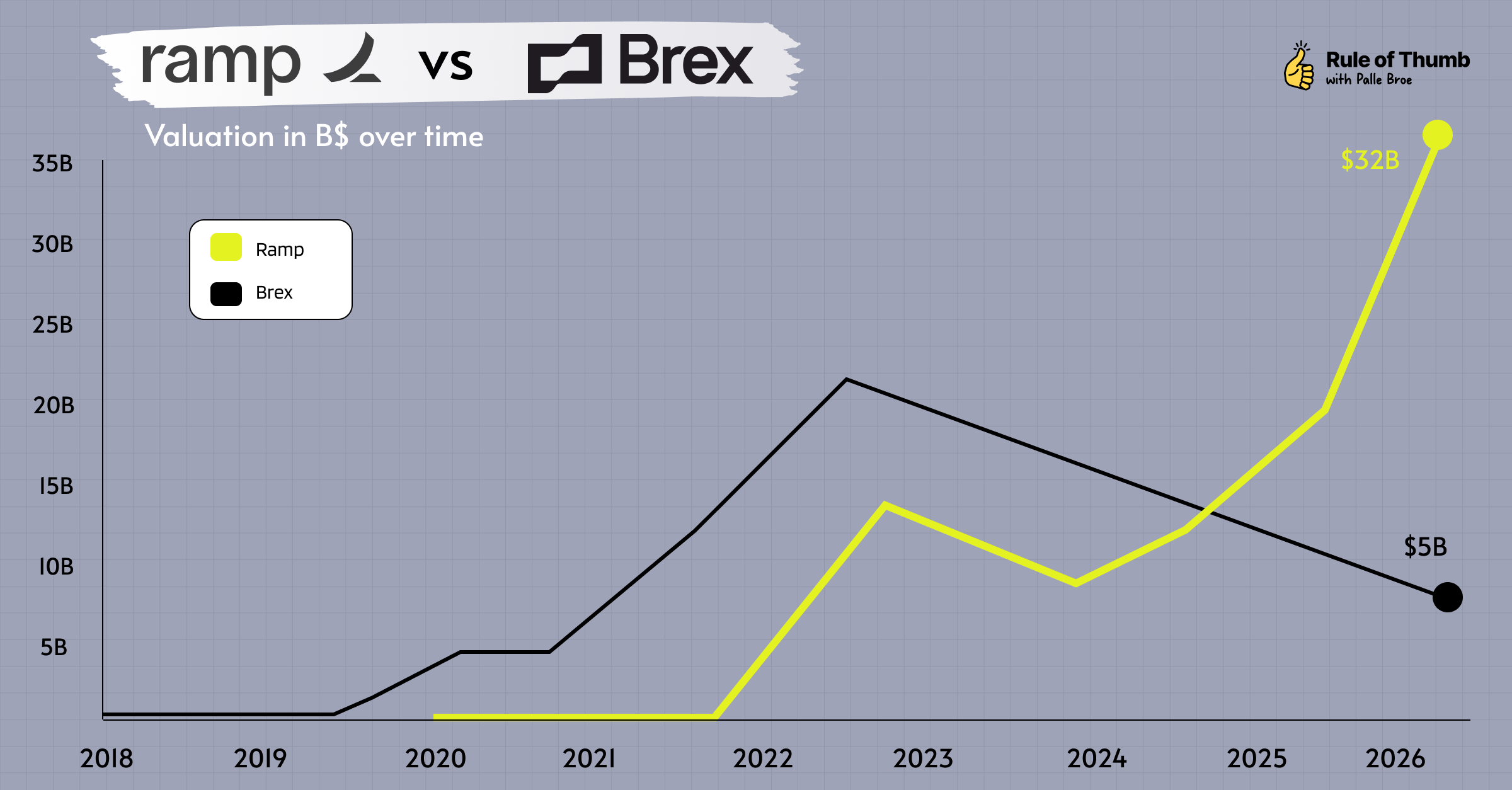 In 2020, the valuation gap between Brex and Ramp was 37 to 1 in Brex’s favor. Six years later, Brex sold to Capital One for $5.15 billion - a whopping 58% discount from its 2022 peak - while Ramp raised at $32 billion and remains private and independent.