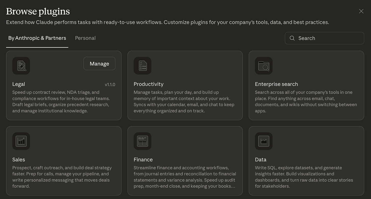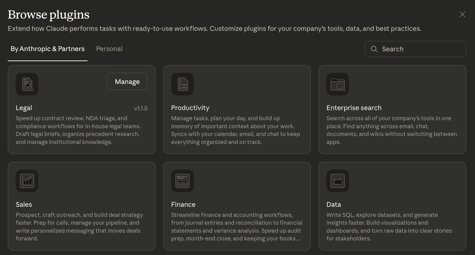â Sales (or swap for Marketing, Legal, or Finance based on your role) - Install the plugin that matches your primary function. Each one loads domain-specific methodology, structured workflows, and connector integrations that make Claudeâs output noticeably more informed and opinionated than a generic prompt.