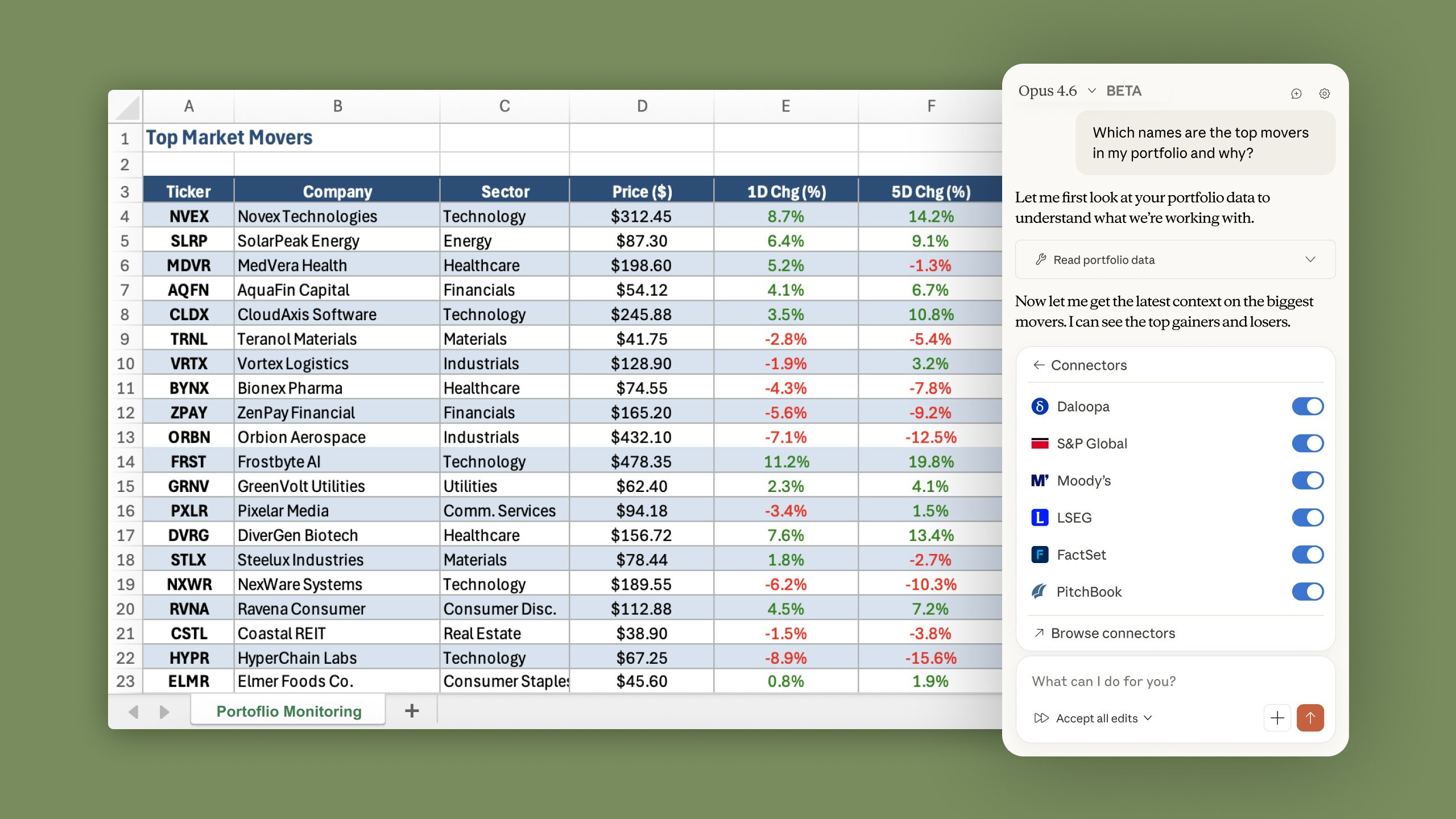 â MCP data connectors. This is the feature most people donât know about, and itâs the one that changes everything. Claude for Excel connects to S&P Global via Kensho, LSEG for live market data, Moodyâs for credit ratings across 600M+ companies, Daloopa for financial data extraction, PitchBook for PE and VC data, FactSet for analytics, Aiera for real-time earnings call transcripts, and Morningstar for investment research. If you have these connectors configured in your Claude account, they work automatically in the Excel sidebar. No additional setup.