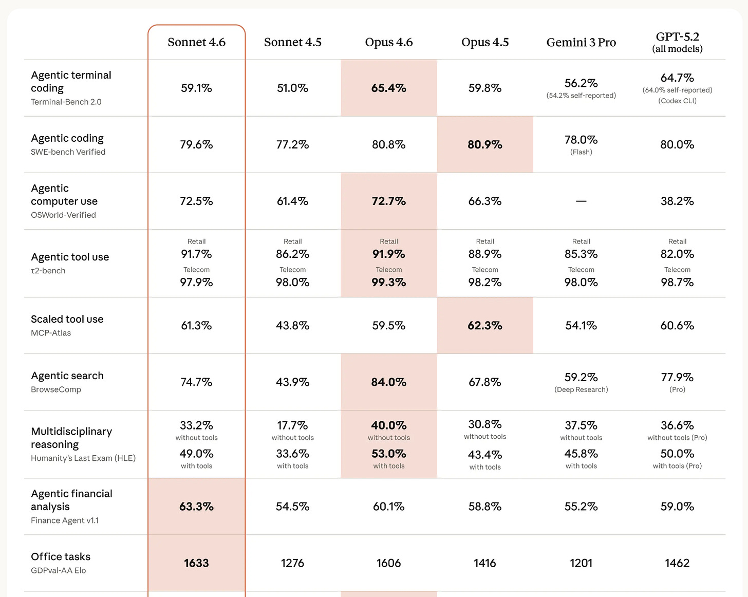 On Finance Agent v1.1, Anthropicâs benchmark for agentic financial analysis, Sonnet 4.6 scores 63.3% - first place, ahead of GPT-5.2 at 59% and, more telling, ahead of Claude Opus 4.6 at 60.1%.