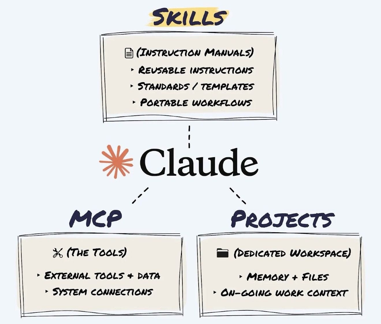 → Skills are your instruction manual. You’re telling Claude “here’s exactly how to perform this task, step by step.” Procedural. Automated. A trained employee.