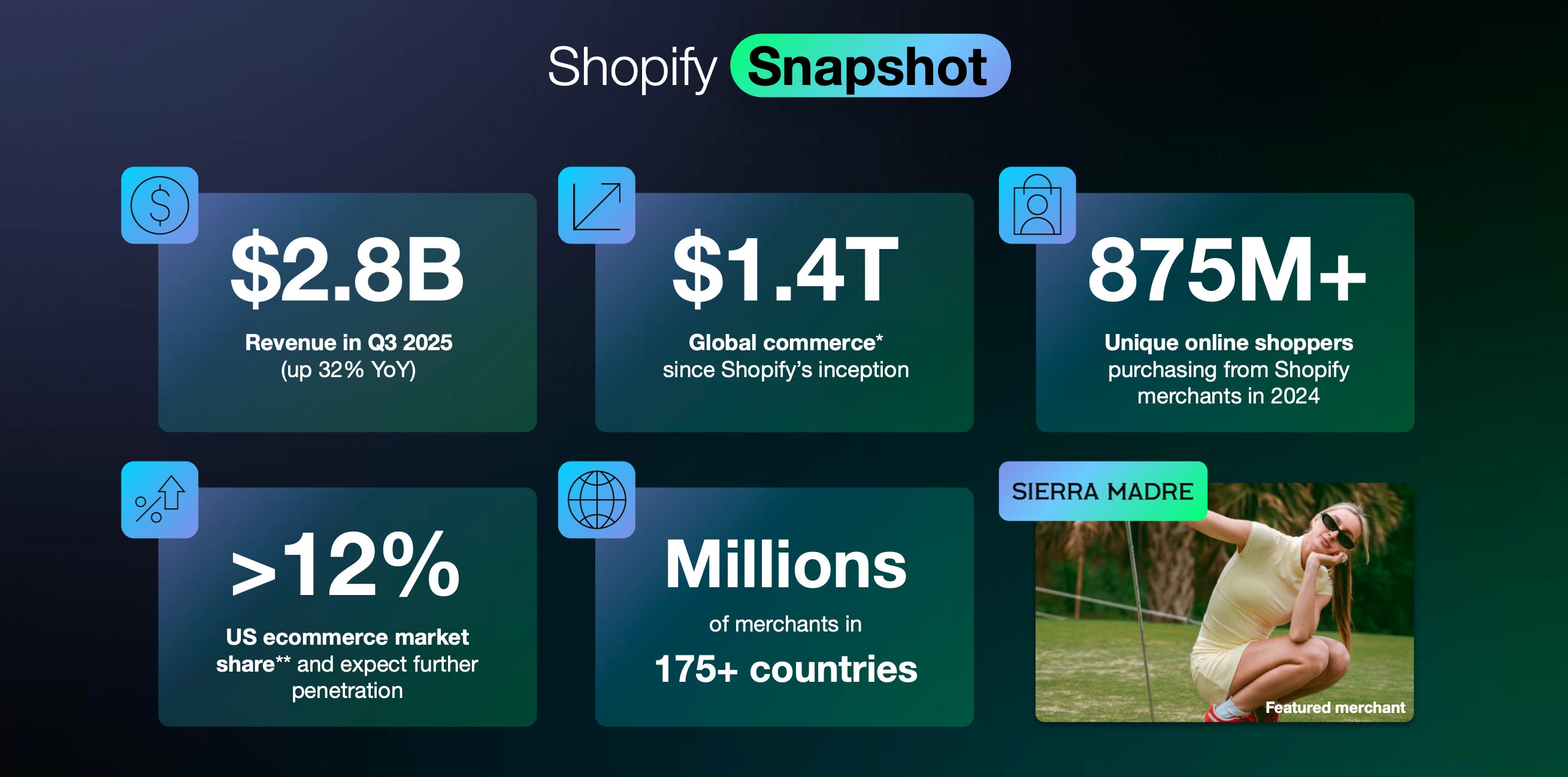 Earnings time 🤑 E-commerce and FinTech giant Shopify SHOP 0.00%↑ has just delivered another solid quarter. In short, it’s a masterclass in balancing hypergrowth with operational discipline in Q3 2025, posting 32% year-over-year revenue growth to $2.84B while expanding free cash flow margins to 18%. Nice!