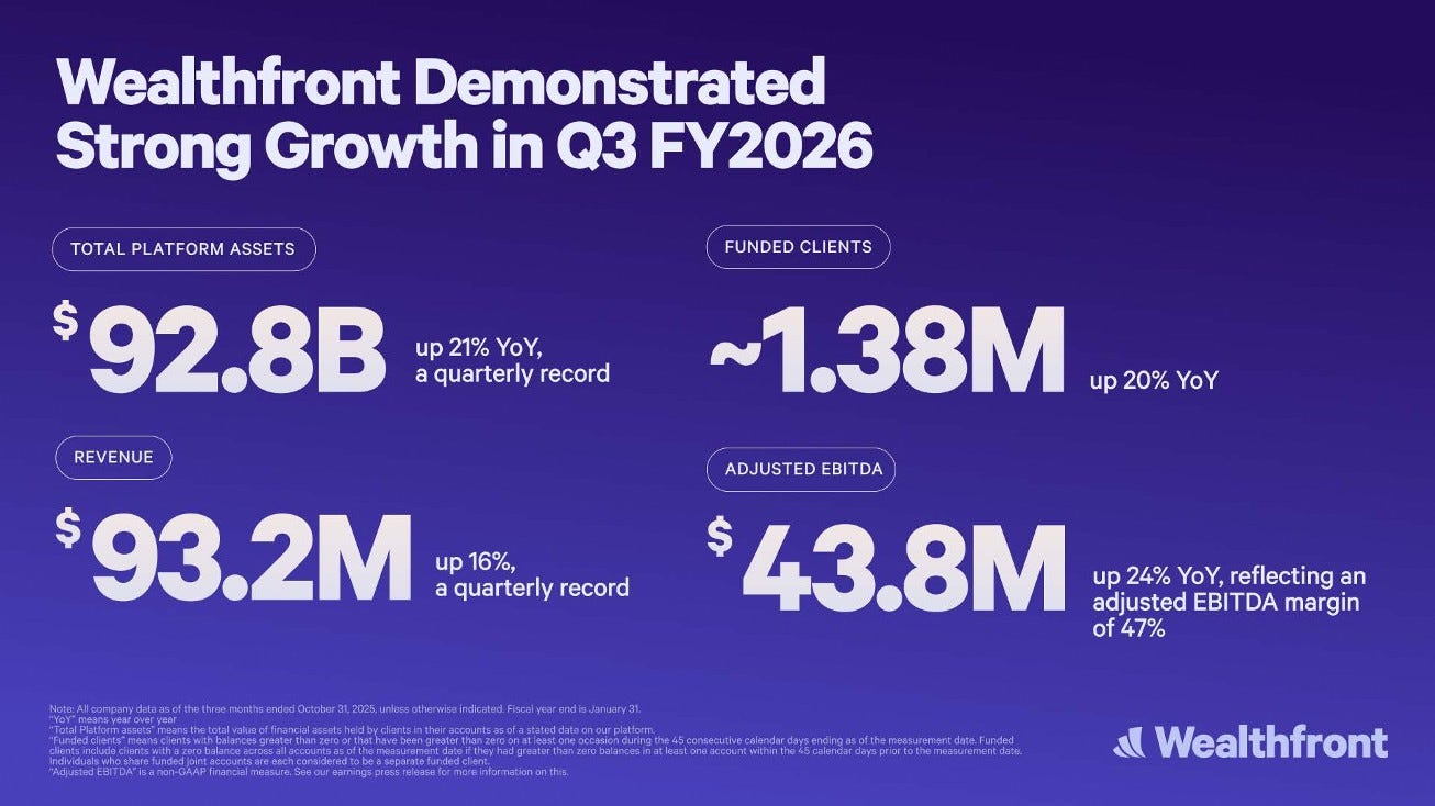 Earnings time 📞 Wealthfront WLTH 0.00%↑ just delivered its 5th consecutive quarter of profitable growth, posting record revenue of $93.2 million (+16% YoY) while generating $41.3 million in free cash flow at a 47% adjusted EBITDA margin 😳