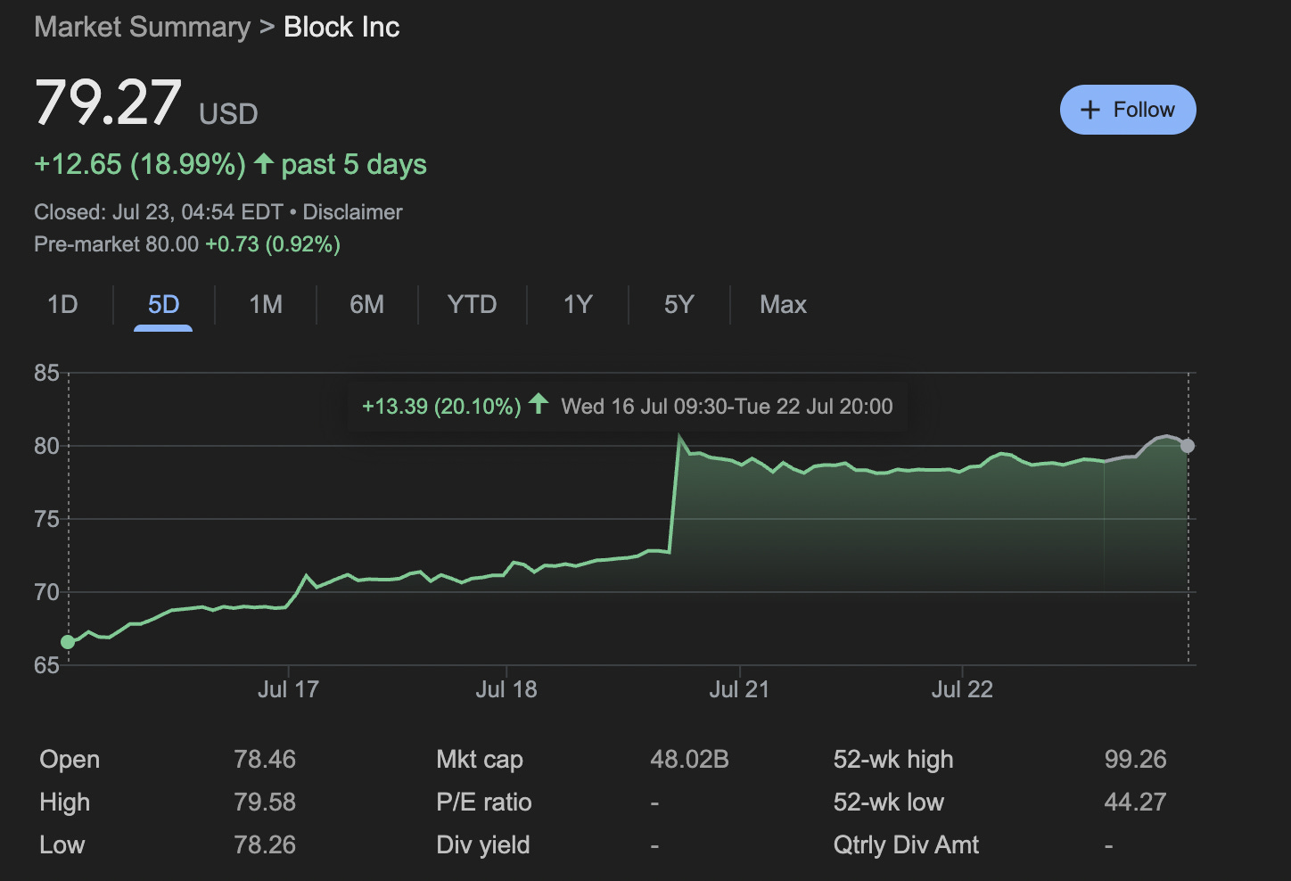 The announcement triggered an immediate market response, with Block shares surging between 9-14% in after-hours trading as investors positioned ahead of mandatory index fund purchases. Not too shabby!