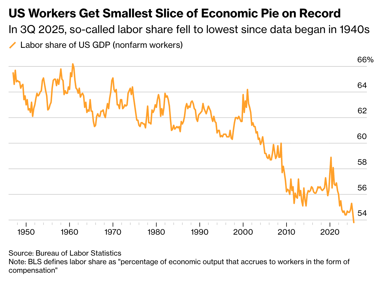 The BLS data on labor share already tells this story in slow motion. Labor’s share of GDP declined from roughly 64% in 1974 to 56% in 2024. A 50-year grind lower that happened slowly enough that it never produced a political crisis sufficient to reverse it. AI could accelerate that trend without producing the kind of dramatic rupture that forces institutional response.