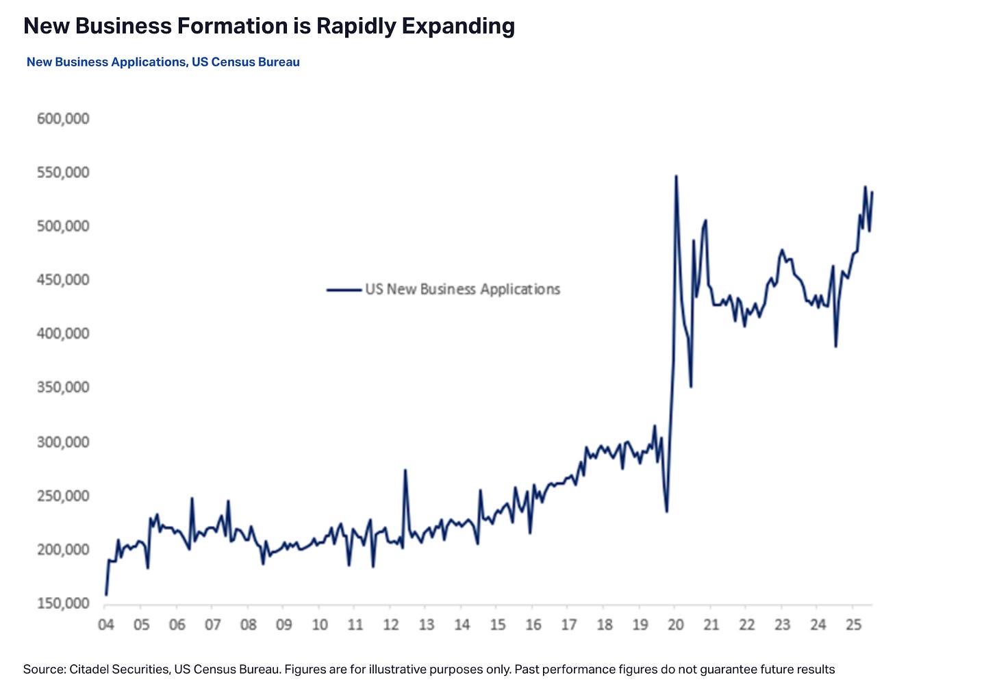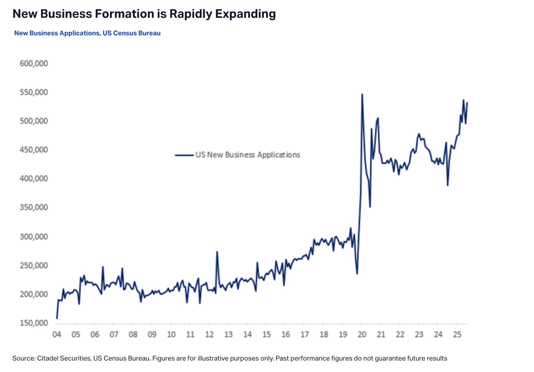→ New business formation is expanding rapidly. The macro picture in February 2026 looks nothing like the preconditions for the crisis described.