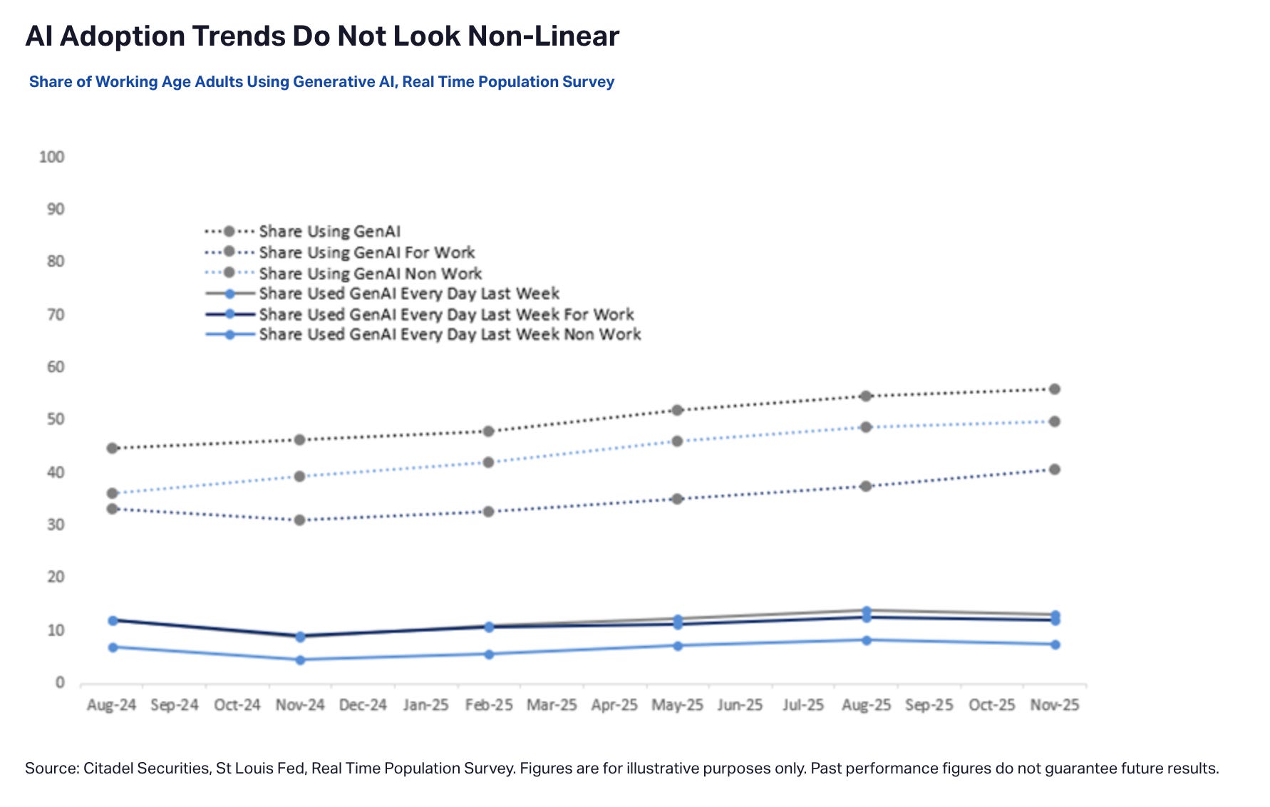 → The St. Louis Fed’s Real-Time Population Survey tracks how intensely Americans use AI for work. If AI displacement were imminent, the data would show an inflection upward in daily use. Instead, it shows unexpectedly stable curves.