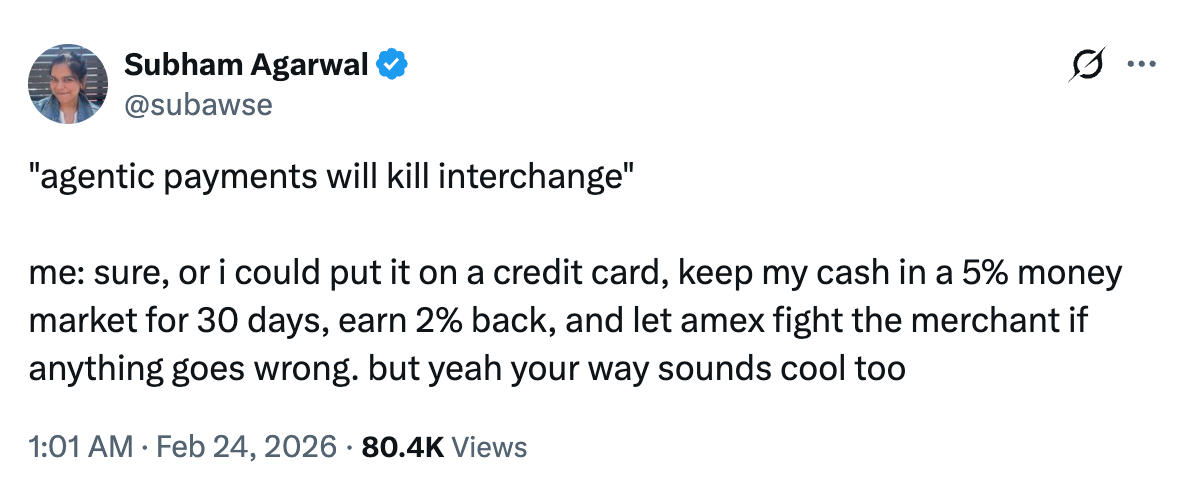 The stablecoin payments scenario is the most falsifiable claim in the piece. It describes AI agents settling consumer transactions via USDC on Solana or Ethereum L2s at a fraction of a penny versus the traditional 2.5% card fee. For this to matter at the described scale within 12-18 months, you need nearly all merchants accepting stablecoin settlement, the majority of consumers funding stablecoin wallets, regulatory frameworks permitting autonomous agent-initiated financial transactions across the globe, and trust infrastructure for AI agents to hold and transfer monetary value on behalf of consumers. None of this exists yet. Building it requires regulatory clarity that does not exist, consumer trust that has not been really established, and merchant adoption that has no precedent at the speed described. U.S. consumers also actively want the features that card rails provide: chargebacks for fraud, purchase insurance, extended warranties, and 1-5% cash-back rewards.