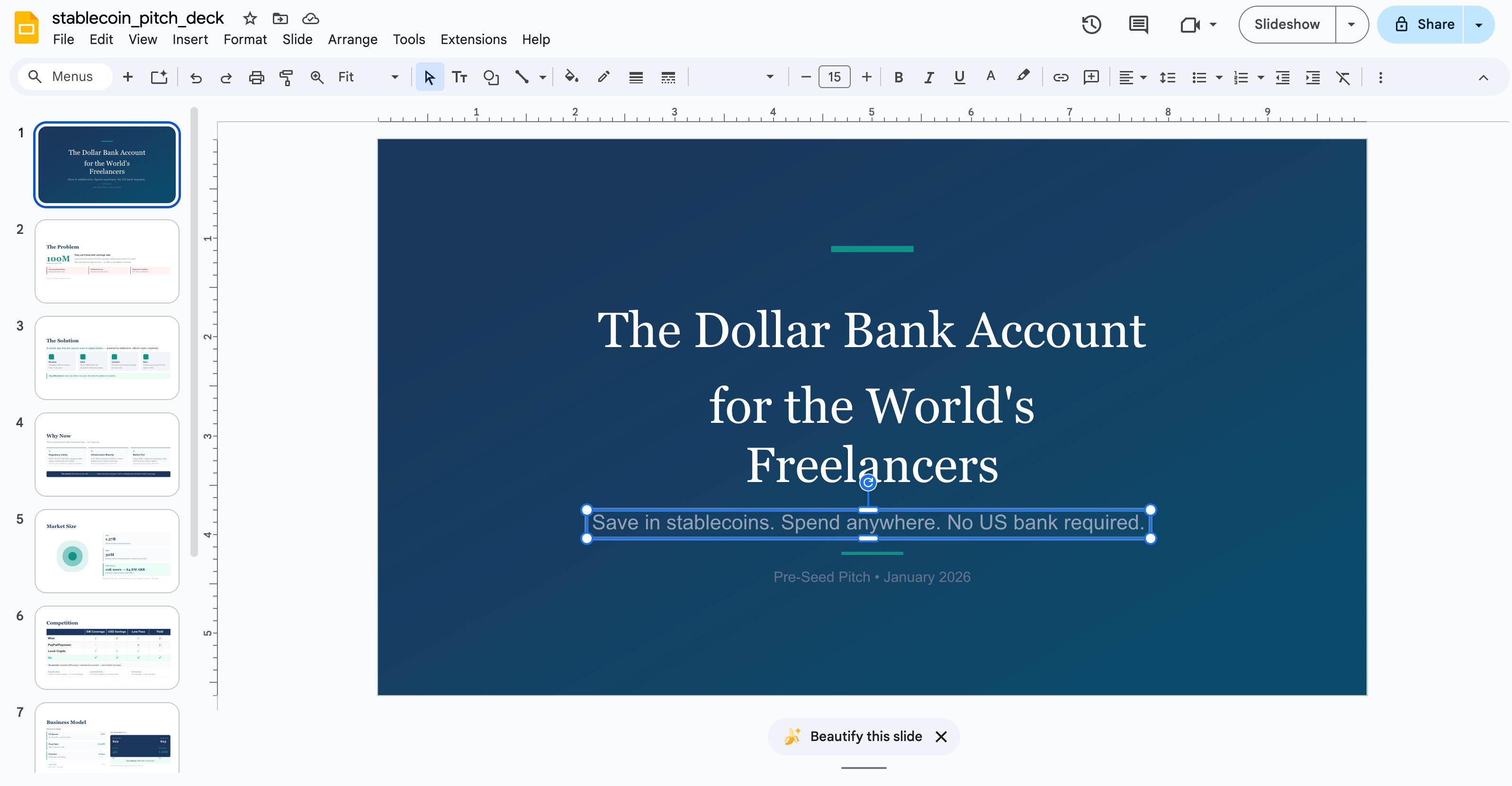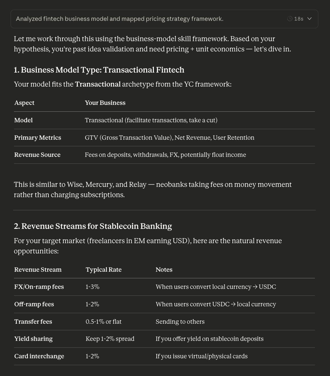 The business model skill identified this as Transactional fintech (like Wise, Mercury, Relay), mapped 5 revenue streams with typical rates, and built out unit economics. The fundraising skill produced a complete pitch deck.