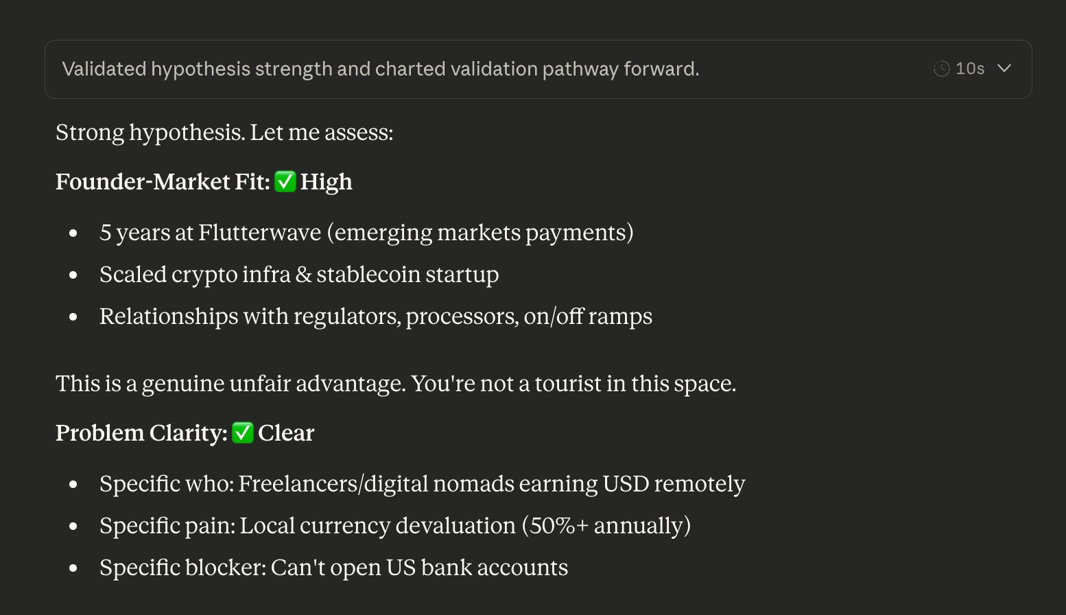 The validation skill assessed founder-market fit first. Five years at Flutterwave, scaled crypto infrastructure at a stablecoin startup, existing relationships with regulators and payment processors. The skillâs verdict: âThis is a genuine unfair advantage. Youâre not a tourist in this space.â