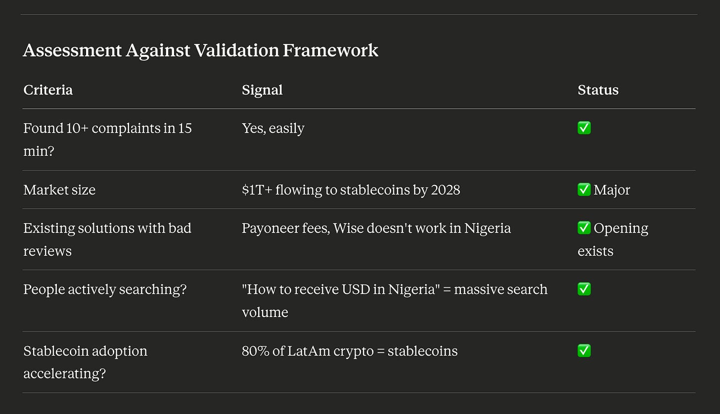 Then the 60-minute validation framework lit up green across every criterion. Found 10+ complaints in 15 minutes? Yes, easily. Market size? $1T+ flowing to stablecoins by 2028. Existing solutions with bad reviews? Payoneerâs fees are brutal, Wise doesnât work in Nigeria. Search volume for âhow to receive USD in Nigeriaâ? Massive. Stablecoin adoption? 80% of LatAm crypto volume.