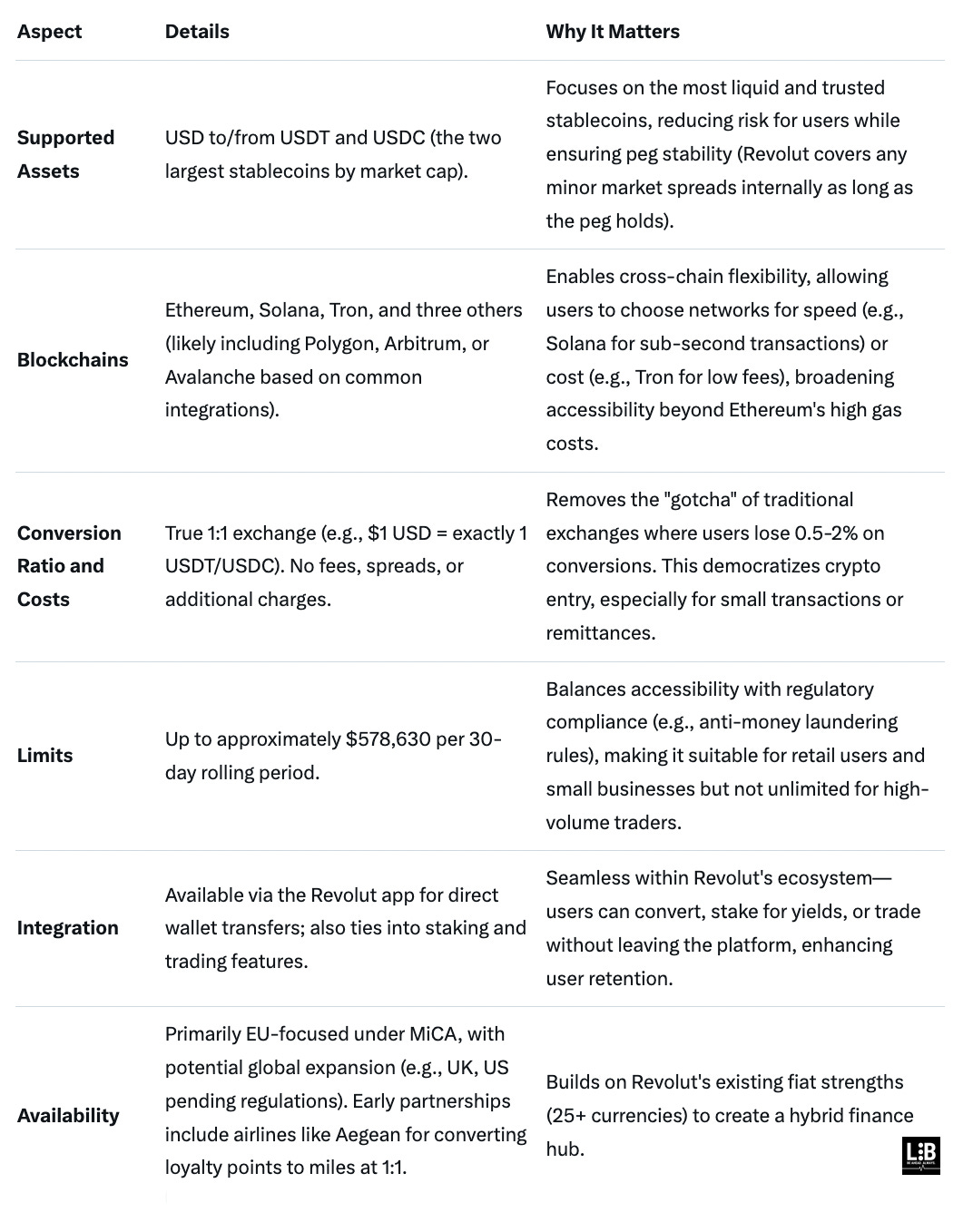 More on this 👉 The service allows users to convert up to approximately $578,630 every 30 rolling days, with Revolut absorbing any market spreads internally to guarantee the exact one-to-one exchange rate as long as the stablecoins maintain their pegs. Nice!