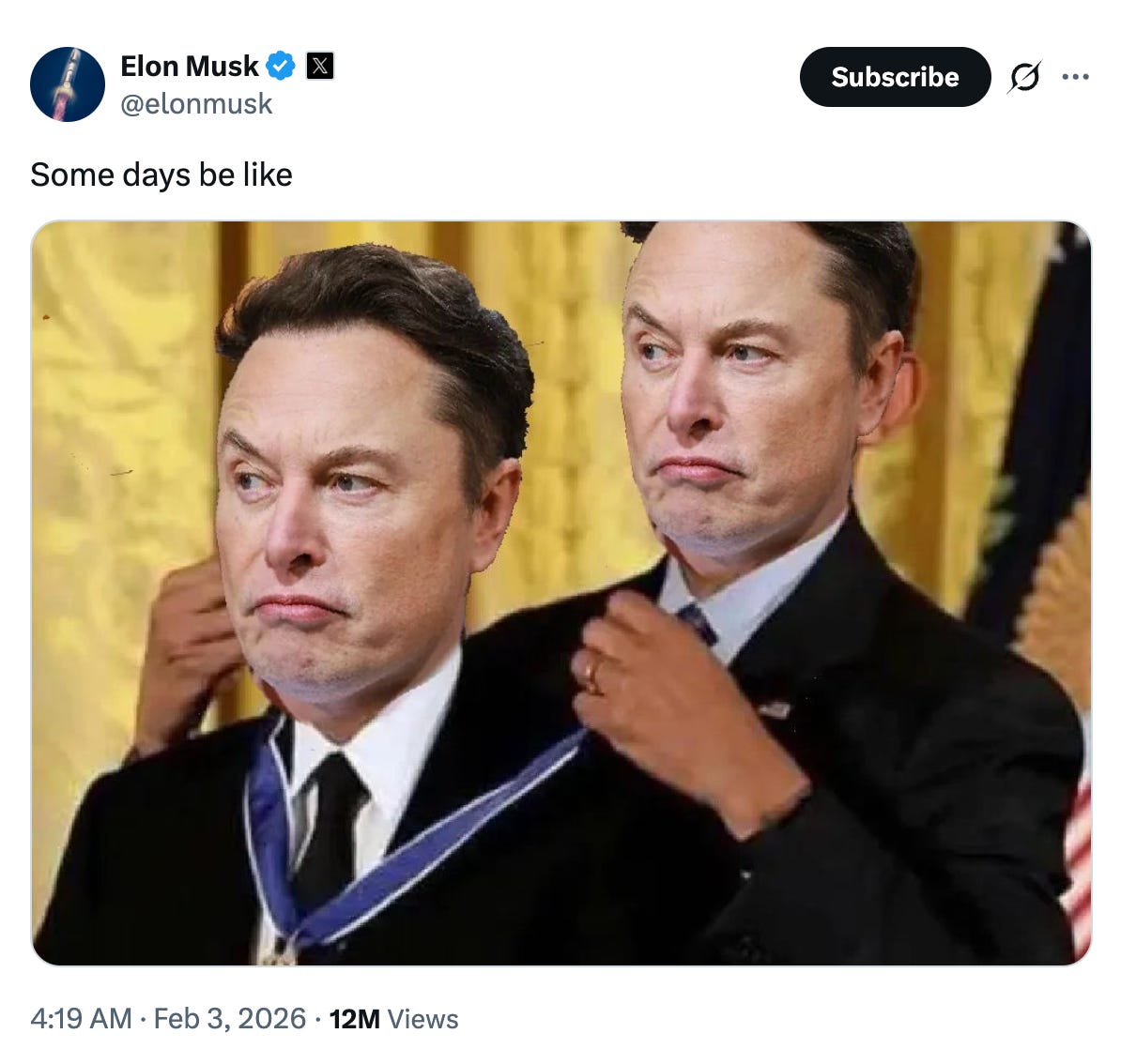 “After a short negotiation with himself, Elon has decided to merge SpaceX and xAI.”