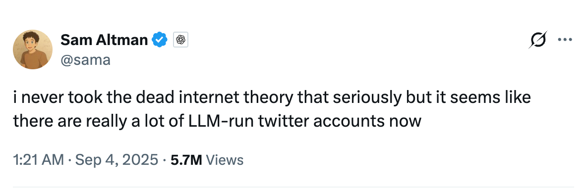 More on this 👉 The immediate pitch is obvious. Bots have made X (or LinkedIn for that matter) nearly unusable for serious discourse, and Altman has been vocal about it. “I never took the dead internet theory that seriously but it seems like there are really a lot of LLM-run twitter accounts now,” he posted in September.