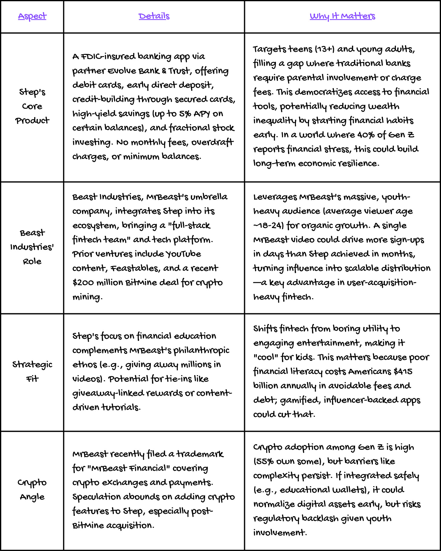 What’s next? 🤔 Looking ahead, if this works, every creator with a nine-figure audience becomes a potential acquirer of distressed fintech infrastructure. The 2021 vintage of neobanks, flush with users but starved of growth capital, suddenly has a new exit path. PayPal and its peers won’t just compete with each other for Gen Z wallets. They’ll compete with whoever those wallets already follow. That said, the regulatory picture is genuinely unresolved. Step is FDIC-insured through Evolve Bank & Trust, which keeps Beast Industries out of the charter business for now. But the MrBeast Financial trademark filing from October covers crypto exchanges, microloans, and investment management. The SEC has already been tightening oversight of financial influencers, and a creator with half a billion followers launching deposit-taking and investment products will force regulators to decide where personal brand ends and fiduciary duty begins. No existing framework was built for this. More importantly, the deeper question is whether creator-led distribution actually improves financial outcomes or just accelerates sign-ups. MrBeast’s philanthropic brand and Step’s financial literacy tools suggest good intentions. But gamified savings challenges and viral giveaways sit uncomfortably close to the engagement tricks that got other fintech apps in trouble with the CFPB. The gap between “making finance fun for teens” and “exposing minors to inappropriate financial products” is narrower than most pitch decks admit. Watch what the first MrBeast-branded Step promotion actually looks like. That will tell you whether this is a financial inclusion story or a customer acquisition story wearing one as a costume.
