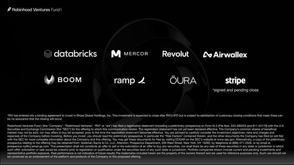 More on this 👉 Robinhood filed to IPO a closed-end fund on the NYSE under ticker RVI, targeting $1 billion at $25 per share. The fund holds stakes in Databricks ($75 million), Revolut ($50 million), Airwallex, Ramp, Oura, and others, with a post-close commitment to buy $14.6 million in Stripe secondaries.