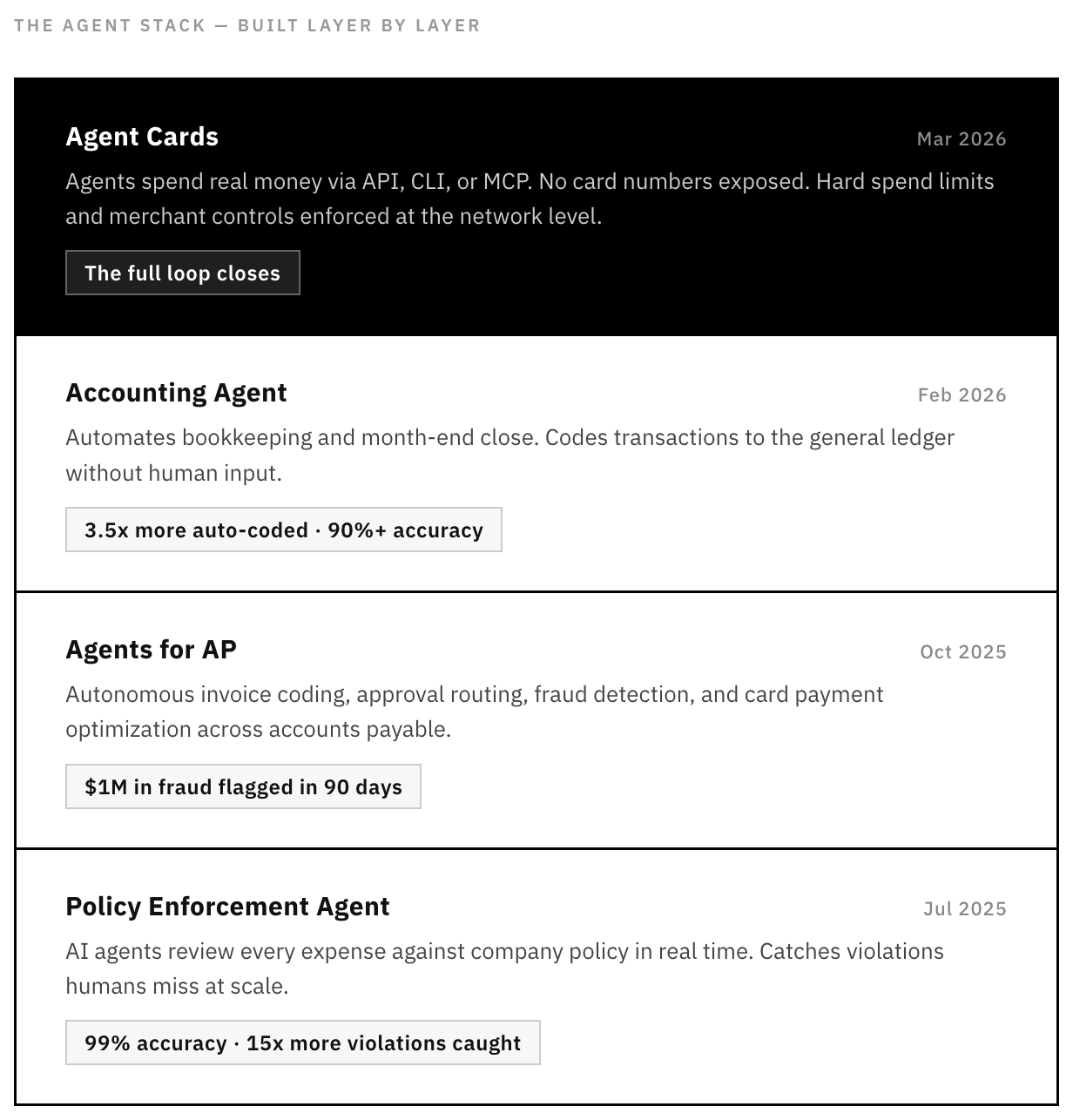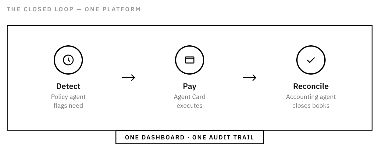 Agent Cards are the last layer: agents that already read, decide, and reconcile can now pay. The full loop closes inside one platform, one dashboard, one audit trail.