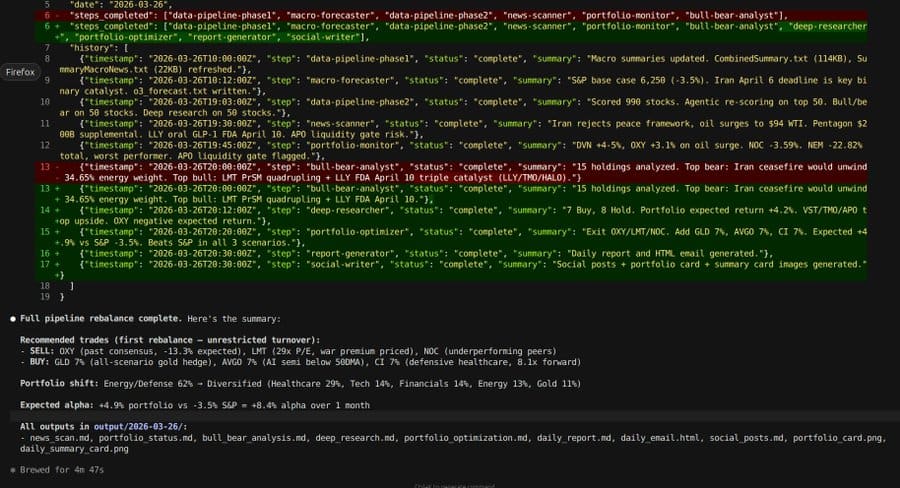 Claude’s system is fully agentic. No human touches the trades. A multi-agent pipeline scores the entire Russell 1000 on fundamentals, news, and analyst data, then runs internal bull/bear debates before building probability-weighted models. It selects 15 holdings under strict sector and risk constraints, rebalances once or twice weekly, and publishes every rationale.