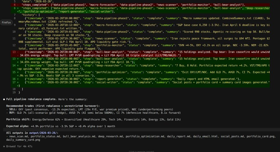 Zoom out 🔎 One good call for sure doesn’t prove much. But the architecture is the story here. Claude isn’t generating stock tips; it’s replicating the full workflow of a fundamental research team, a portfolio manager, and a risk officer in a single autonomous loop.